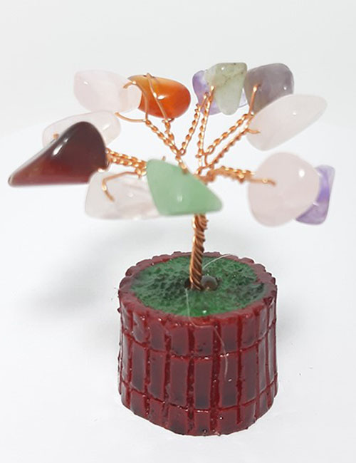 Дървото Фън Шуй е направено от каменни кристали, съответстващи на 7-те чакри, закрепени с фина медна тел върху смолена опора.