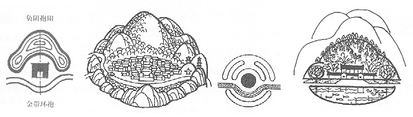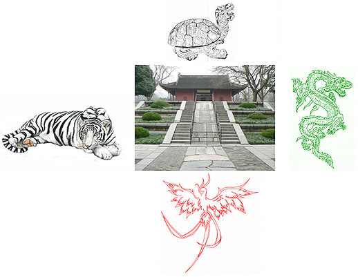 С развитието на учението и след като Хуанди обединява тотемите змия и мечка на различните племена в новия тотем дракон, в по-късни текстове вече са описани ЧЕТИРИТЕ ЗАЩИТНИКА– това са четири животни, които защитават дома и спомагат за спокойното му съществуване. Отзад (север) е ЧЕРНАТА КОСТЕНУРКА, която представлява планина или голям хълм и предпазва дома от студените ветрове и вражеските нашествия. Пред входната врата (юг) трябва да има простор за движение и работа, след което по-далеч може да има ниски възвишения – това е ЧЕРВЕНИЯТ ФЕНИКС. Заставайки пред дома с гръб към него отдясно (запад) трябва да има по-нисък от Костенурката хълм за странична защита – това е БЕЛИЯТ ТИГЪР. Отляво (изток) също трябва да има подобна защита – това е ЗЕЛЕНИЯТ ДРАКОН.