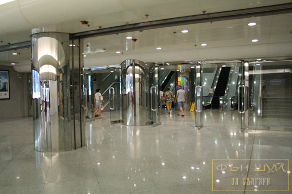 Безрамковата стъклена дограма, добре проектираното осветление и обличането на масивните колони с огледален инокс създават чувство на простор в подземния вход към метрото.