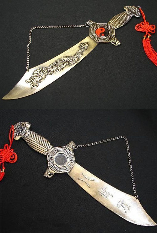 В подобно описание очакваме обясненията да се онагледят с изображението на обекта. В настоящия случай този, който е писал, не е виждал предмета. След като има верижка за окачване, това е сувенир за стена. Поставянето на огледало Ба Гуа на дръжката на меч е безсмислено действие. Според описанието, то е от страната на дракона, но на снимката е от другата страна. На дръжката с дракона има пак Ба Гуа, на която в средата е знакът Ин-Ян, но той е извъртян наляво с 45 градуса. Загадка остава и разликата между Мистичен Възел и Фън Шуй Плетка.