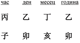 Ето как изглежда един хороскоп в Четирите стълба на съдбата (правилно е изписването да се прави с йероглифи):
