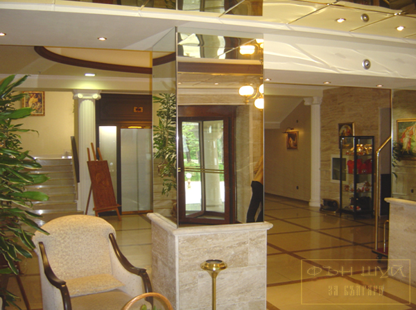 Облечената с огледала колона на входа на хотела, дори и само в горната част, не затормозява влизащите с масивността си.